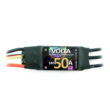 The Volta 50A G2 ESC has a switched BEC with an adjustable output of 5-6V and a current of up to 4A. Supports 2-4S Lipo battery power and 50A continuous current (60A peak).